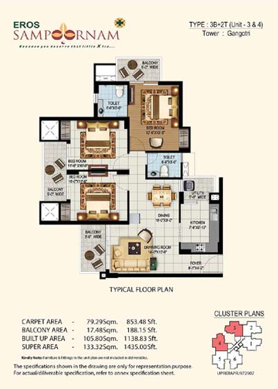 3BHK + 2T (Unit 3 & 4) - 1435 SQ.FT
